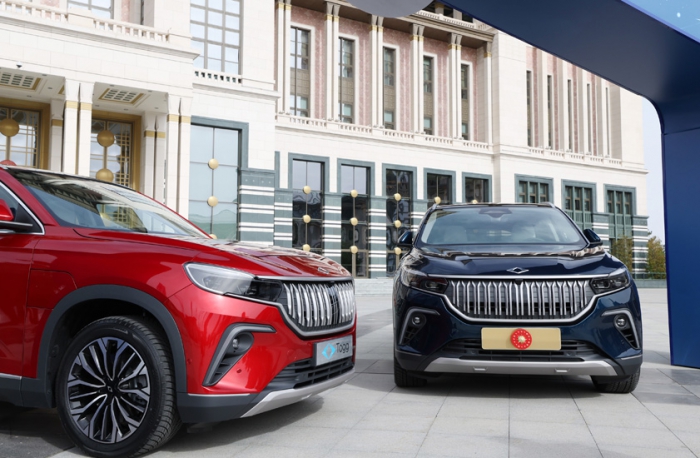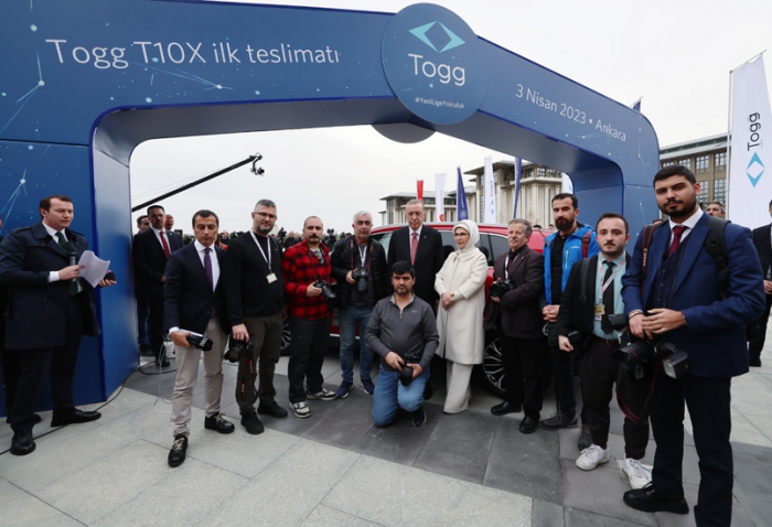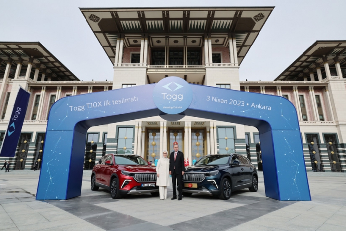 Cumhurbaşkanı Erdoğan ve eşi Emine Erdoğan, üzerinde Cumhurbaşkanlığı forsu olan "Gemlik" renkli Togg makam aracı ve Emine Erdoğan'a ait 34 EE 2071 plakalı "Anadolu" renkli Togg'un önünde poz verdi.