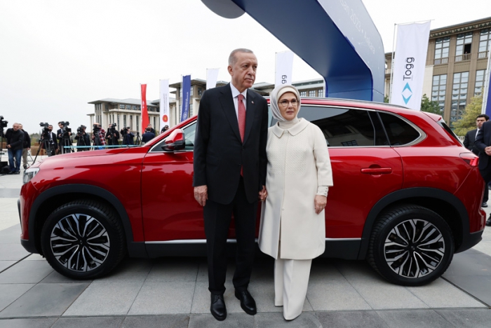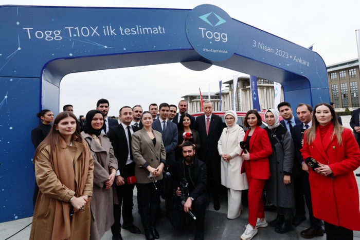 Daha sonra Cumhurbaşkanı Erdoğan eşi Emine Erdoğan ile "Anadolu" renkli Togg'a bindi. Cumhurbaşkanı Erdoğan ve Emine Erdoğan, Togg Üst Yöneticisi (CEO) Gürcan Karakaş'tan araca ilişkin bilgi aldı.