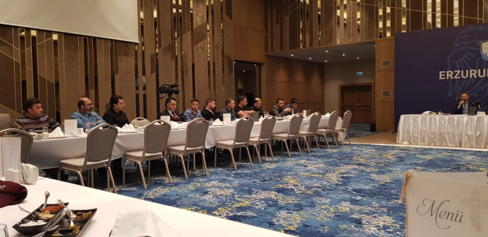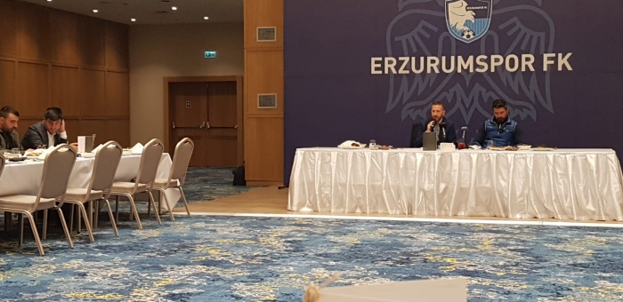 Bir otelin konferans salonunda gerçekleştirilen toplantıda Erzurumspor FK Başkanı Ahmet Dal ve Teknik Direktör Hakan Kutlu gazetecilerin sorularını cevapladı. Toplantıda kulübün son durumu, Kazım Karabekir Stadyumu ve gündeme dair konulara yer verildi. Kulüp Başkanı Ahmet Dal, Ankara Keçiörengücü maçını Rize'de oynanmasına müsaade eden Çaykur Rizespor Başkanı İbrahim Turgut'a teşekkür ederken, ilerleyen haftalardaki maçların nerede oynanacağının belirsizliğini koruduğunu söyledi. Öte yandan Erzurumspor FK Teknik Direktörü Hakan Kutlu ise sezonu en iyi yerde bitirip, gelecek sezon için hazırlıklara başlayacaklarını ifade etti. Kutlu, takımın kaliteli bir kadrodan oluştuğunu söylerken, Erzurumspor'u da büyük camiasından etkilendiği için tercih ettiğini açıkladı.