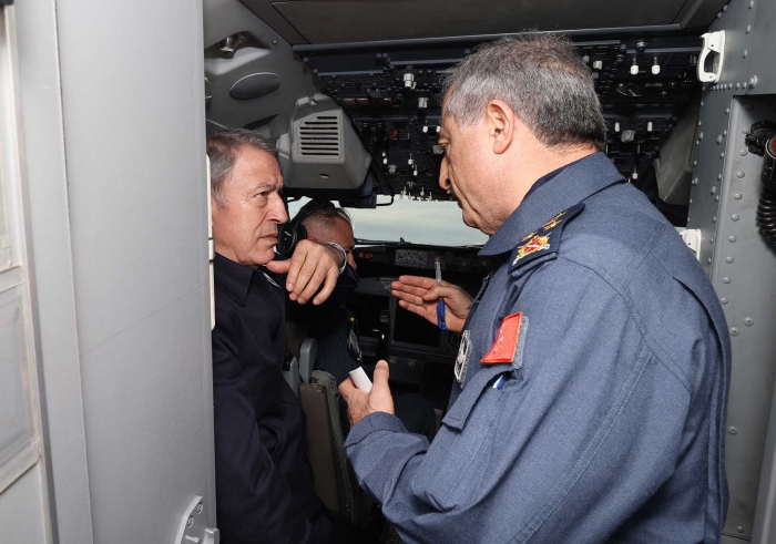 Diyarbakır 8'inci Ana Jet Üs Komutanlığında inceleme ve denetlemelerde bulunan Bakan Akar ve beraberindeki TSK Komuta Kademesi, kentin caddelerinde vatandaşla buluşmanın ardından "Doğu” isimli havadan ihbar kontrol uçağının görev uçuşuna katılarak kara, deniz ve hava unsurlarının faaliyetlerine ilişkin havadan inceleme ve denetlemelerde bulundu.