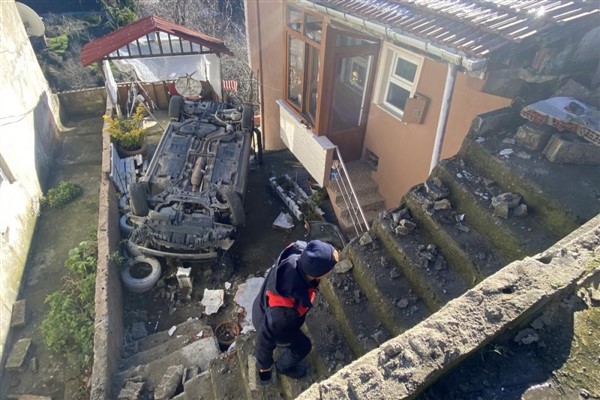 Zonguldak’ta sürücünün kontrolünden çıkan otomobil 10 metre yükseklikten bir evin önüne düştü. Kazada araç sürücüsü E.Ö(50)ve yanında bulunan eşi R.Ö(50) hafif şekilde yaralandı.