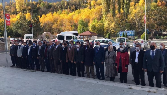 İspir Meydanında Atatürk Anıtına çelenk sunumu yapan muhtarlar saygı duruşunda bulundu, İstiklal Marşı’nı okudu.