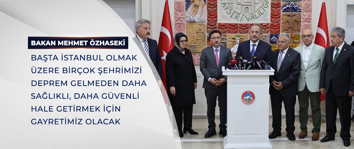 Çevre, Şehircilik ve İklim Değişikliği Bakanı Mehmet Özhaseki, bir dizi ziyarette bulunmak üzere gittiği Kayseri’de yaptığı konuşmada "Özellikle başta İstanbul olmak üzere birçok şehrimizi, kentimizi deprem gelmeden daha sağlıklı, daha güvenli hale getirmek için de bir gayretimiz olacak." dedi.