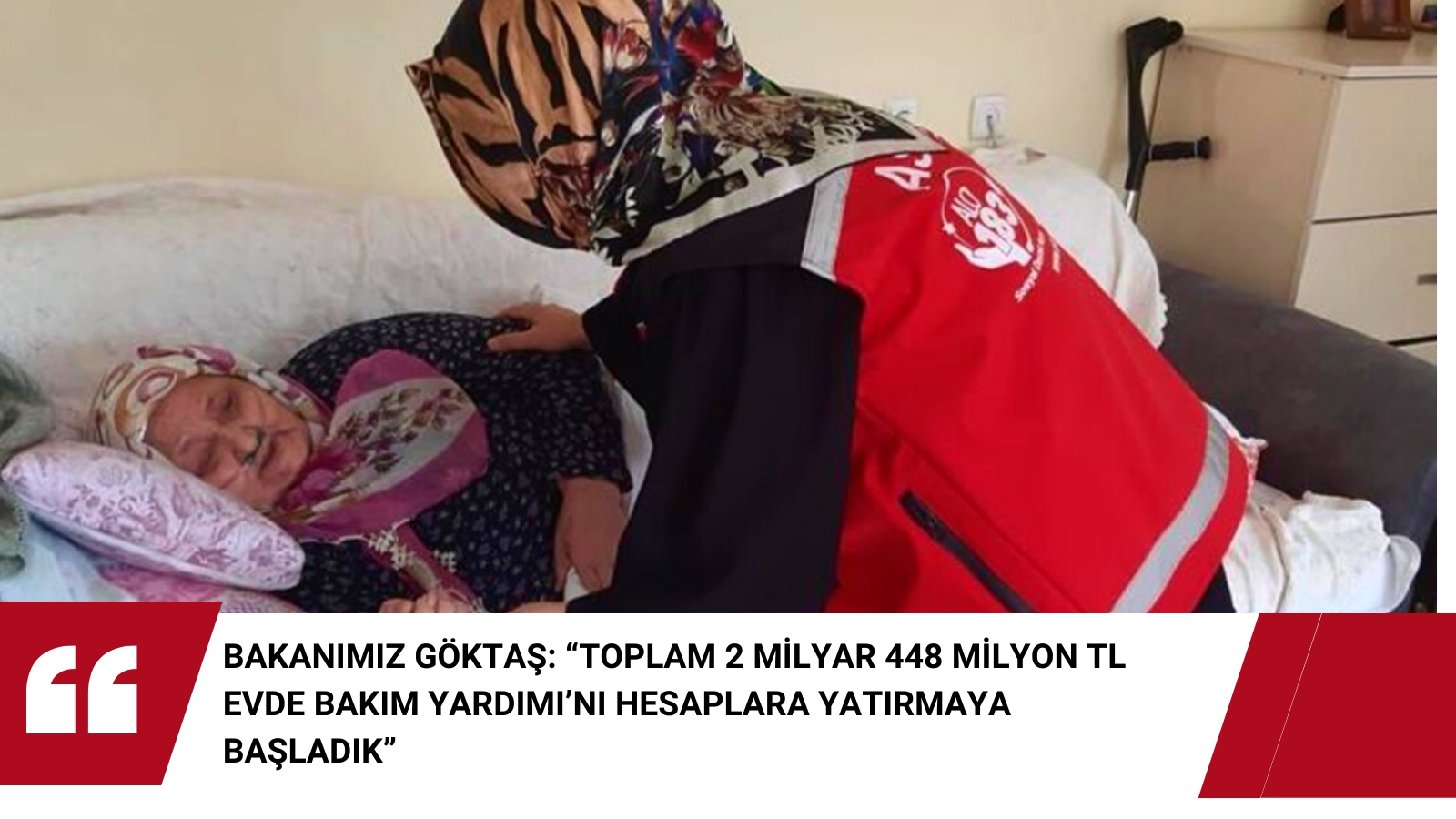 Aile ve Sosyal Hizmetler Bakanı Mahinur Özdemir Göktaş, bakıma ihtiyacı olan ağır engelli vatandaşlar ve ailelerine ekonomik destek sağlamak amacıyla bu ay toplam 2 milyar 448 milyon TL Evde Bakım Yardımı’nı hesaplara yatırmaya başladıklarını açıkladı
