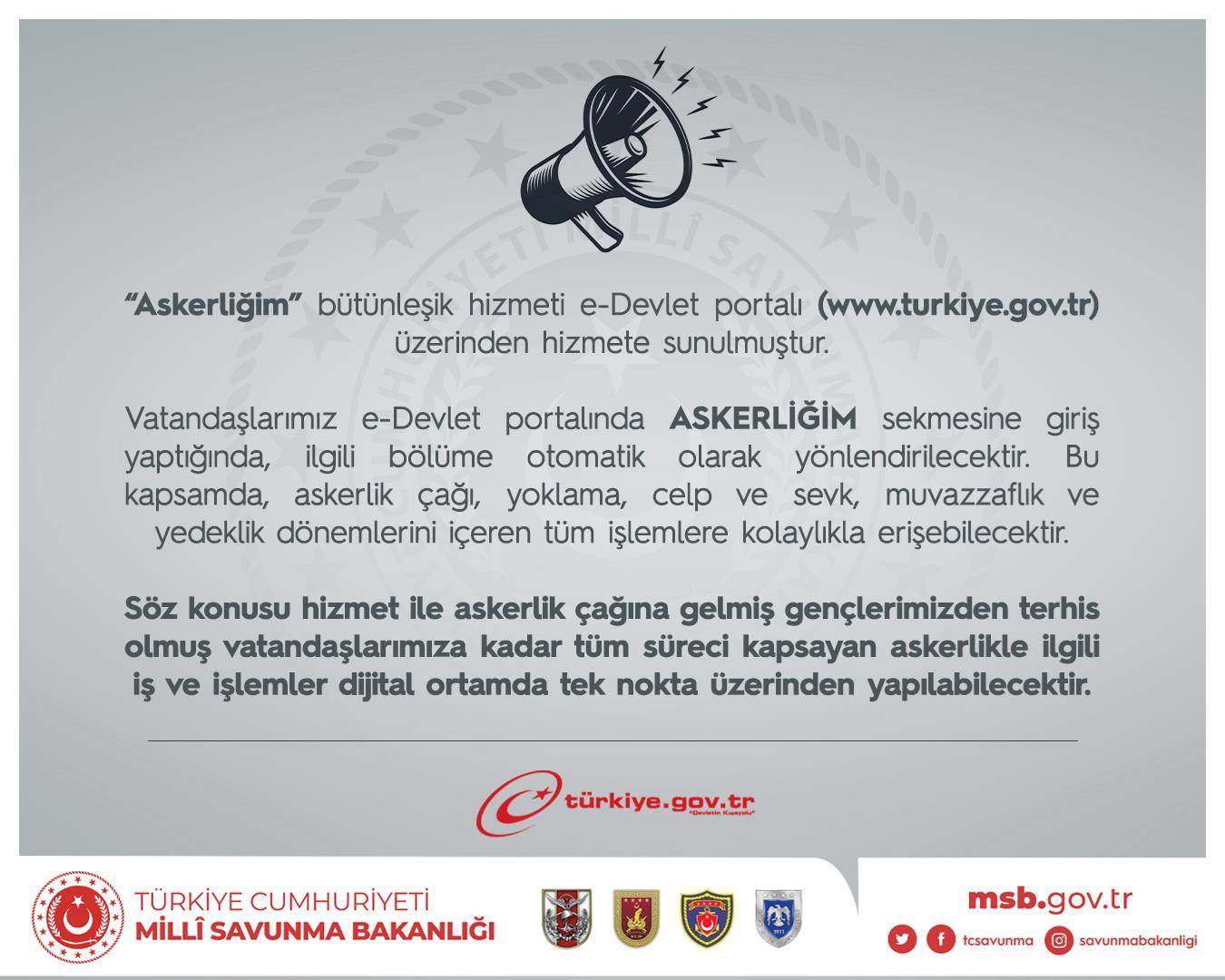 Vatandaşlarımızın askerlik çağı, yoklama, celp ve sevk, muvazzaflık ve yedeklik dönemlerini içeren tüm işlemlere kolaylıkla erişebilmesini sağlayan “Askerliğim” bütünleşik hizmeti e-Devlet portalı (www.turkiye.gov.tr) üzerinden hizmete sunuldu.