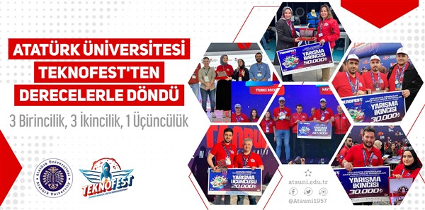 Türkiye Teknoloji Takımı Vakfı ve Sanayi ve Teknoloji Bakanlığı yürütücülüğünde düzenlenen TEKNOFEST Havacılık, Uzay ve Teknoloji Festivali yoğun bir katılımla gerçekleşti. TEKNOFEST’23 kapsamında düzenlenen yarışmaların ödülleri, Cumhurbaşkanı Recep Tayyip Erdoğan’ın katılımıyla sahiplerini buldu. Etkinlik kapsamında düzenlenen yarışmalarda Atatürk Üniversitesi öğrencilerinin proje takımları başarılarıyla göz doldurdu. 3 birincilik, 3 ikincilik ve 1 üçüncülük ile yarışmalardan ayrılan Atatürk Üniversitesi öğrencileri, TEKNOFEST’in ön plana çıkan ekiplerinden oldu.