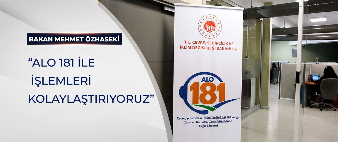 Bakanlığın ALO 181 Çağrı Merkezi’ni arayan vatandaşlara, konut projeleri, tapu işlemleri, deprem sonrası hasar tespit çalışmaları, deprem bölgesinde başlatılan ‘Yerinde Dönüşüm’ projesi, çevre kirliliği gibi birçok konuda bilgi veriliyor. ALO 181 Çağrı Merkezi aracılığıyla tapu ve kadastro işlemlerinde de vatandaşların kolaylıkla randevu alması, Web Tapu üzerinden başvuru yapması sağlanıyor.