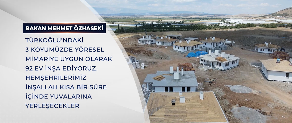 Çevre, Şehircilik ve İklim Değişikliği Bakanı Mehmet Özhaseki, 6 Şubat depremlerinin merkez üssü Kahramanmaraş’ın Türkoğlu ilçesine bağlı üç köyde yürütülen konut yapım çalışmalarını anlatan bir videoyu, resmî sosyal medya hesabından yayımladı. Bakan Özhaseki, paylaşımındaki mesajında, “Depremden etkilenen şehirlerimizde, vatandaşlarımızın huzurlu yuvalarına bir an evvel kavuşabilmeleri ve hayatın normale dönmesi için durup dinlenmeden çalışıyoruz. Türkoğlu'ndaki 3 köyümüzde yöresel mimariye uygun olarak 92 ev inşa ediyoruz. Hemşehrilerimiz inşallah kısa bir süre içinde yuvalarına yerleşecekler.” ifadelerini kullandı.