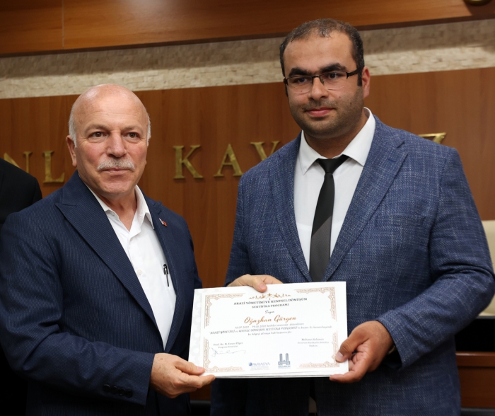 Erzurum Büyükşehir Belediyesi Genel Sekreter Yardımcısı Murat Altundağ da, sertifika töreninde yaptığı konuşmada, “Şehrimizin sahip olduğu doğal kaynaklar ile sosyo-ekonomik ve kültürel değerler dikkate alındığında Erzurum ilinin geleceğine doğru yön vermek amacıyla bütüncül ve kapsamlı bir arazi yönetimi oluşturmak için Erzurum Büyükşehir Belediye Başkanımız Sayın Mehmet Sekmen Beyefendi’nin talimatıyla yürüttüğümüz çalışmalar kapsamında arazi kullanım envanterinin oluşturulması ve buna dayalı arazi kullanım planlarının yapılması süreci, ülkemiz için model bir proje olarak kabul edilebilir” diye konuştu. Altundağ, şöyle devam etti: “Sayın Başkanımız Mehmet Sekmen Bey’in desteğiyle Büyükşehir Belediyesi yetki alanında kırsal ve kentsel alanların bütününe yönelik atılan bu adım, ülkemiz belediyecilik tarihinde bir ilk ve öncü bir çalışma olarak anılabilir. Böylece koruma-kullanma dengesinin sağlanması, gelişmişlik düzeyinin yükseltilmesi, sanayileşme ve kentsel gelişimin doğru yönde ilerlemesi, imar ve kentsel dönüşüm uygulamalarında ihtiyaç duyulan rezerv alanların sağlanması, kentsel-kırsal arazi kullanım dengesinin doğru yönetilebilmesi ve özellikle ilin araziye bağlı varlık değerinin ortaya çıkması mümkün olabilecektir. Bu bağlamda kadim şehrimiz Erzurum için il bütününde kapsayıcı ve öncelikli kentsel dönüşüm olmak üzere; Arazi Yönetimi, Kadastro-Tapu Bilgisi, Arazi Kullanımı ve Planlama, Tarımsal Amaçlı Arazi Kullanımı, Arazi Ekonomisi, İmar Uygulaması, Arazi Bilgi Sistemi eğitim modülleri ile 5 haftalık eğitim programını tamamlamış bulunmaktayız.” Konuşmaların ardından eğitim programına katılanlara sertifikaları verildi.