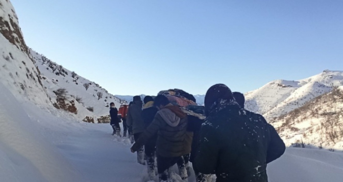 Yaklaşık 28 saat sonra hastaya ulaşabilen sağlık ekipleri, hastanın yakınlarıyla birlikte 3 kilometre köylülerin omuzlarında 2 kilometre ise sağlıkçıların kızağa çevrilen sedyesinde taşınarak ambulansa ulaştırıldı.