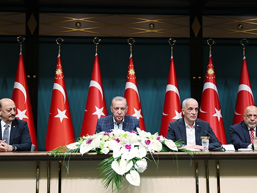 Kamu işçisine yüzde 45 zam yapıldığını duyuran Cumhurbaşkanı Erdoğan, "Protokolle kamu işçilerimizin taban ücretleri, ücret zamları, sosyal yardımları, maktu ödemeleri belirlenmektedir. Epeyce ayrıntısı bulunan çerçeve neticesiyle refah payı dahil yüzde 45 zam yapıyoruz. En düşük kamu işçisi ücretini 15 bin liraya çıkarıyoruz. İş primi ödemesi bulunmayan işçilere yüzde 4-6 arasında prim ödemesi uygulamasını da getiriyoruz. Ayrıca gazi, terör mağduru ve şehit mağduru işçilerimizin çıplak ücretlerine yüzde 10'luk ilave yapıyoruz. Fazla çalışma ücretlerinde yüzde 70'lik artışa gidiyoruz. Gece çalışanların ücretlerini yüzde 8 zamlı ödenmesini öngörüyoruz. Giyim ve yemek yardımlarının rakamlarını güncelleyerek ücret zammı oranında artırıyoruz. Ek ödeme, tediye dışı ikramiye gibi başlıklarda da artışlar yapıyoruz. Toplu sözleşmenin işçilerimize, kurumlarımıza hayırlı olmasını özellikle diliyorum." dedi.