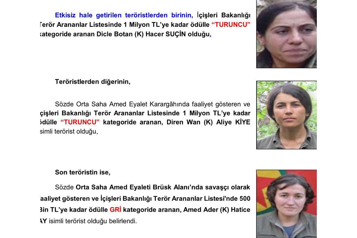 Eren Abluka-34 operasyonu çerçevesinde Diyarbakır'ın Dicle ilçesi Görese Dağı kırsalında 20 Eylül'de 3 terörist etkisiz hale getirilmişti. Kimlikleri belirlenen teröristlerden ‘Dicle Botan' kod adlı Hacer Suçin ve ‘Diren Wan' kod adlı Aliye Kiye'nin Terörde aranalar listesinde ‘turuncu' kategoride, ‘Amed Ader' kod adlı Hatice Ay'ın ise ‘gri' kategoride arandığını tespit edildi.