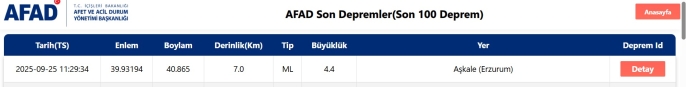Erzurum’un Aşkale ilçesinde bugün saat 11.29’da 4,4 büyüklüğünde bir deprem meydana geldi. Afet ve Acil Durum Yönetimi Başkanlığı (AFAD) verilerine göre, deprem yerin 7 kilometre derinliğinde gerçekleşti.