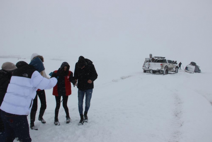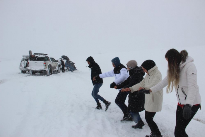 Erzurum’da 3 gündür aralıklarla devam eden kar yağışı sonrası birçok mahalleye ulaşım sağlanamıyor. Off-Road araçları dahi kapanan yollarda ilerlemekte güçlük çekerken birçok araç kara saplandı. Saplanan araçlar bulundukları yerden kurtarılırken bir grup genç ise soğuktan etkilenmemek için araçların yanı başında halay çekti.