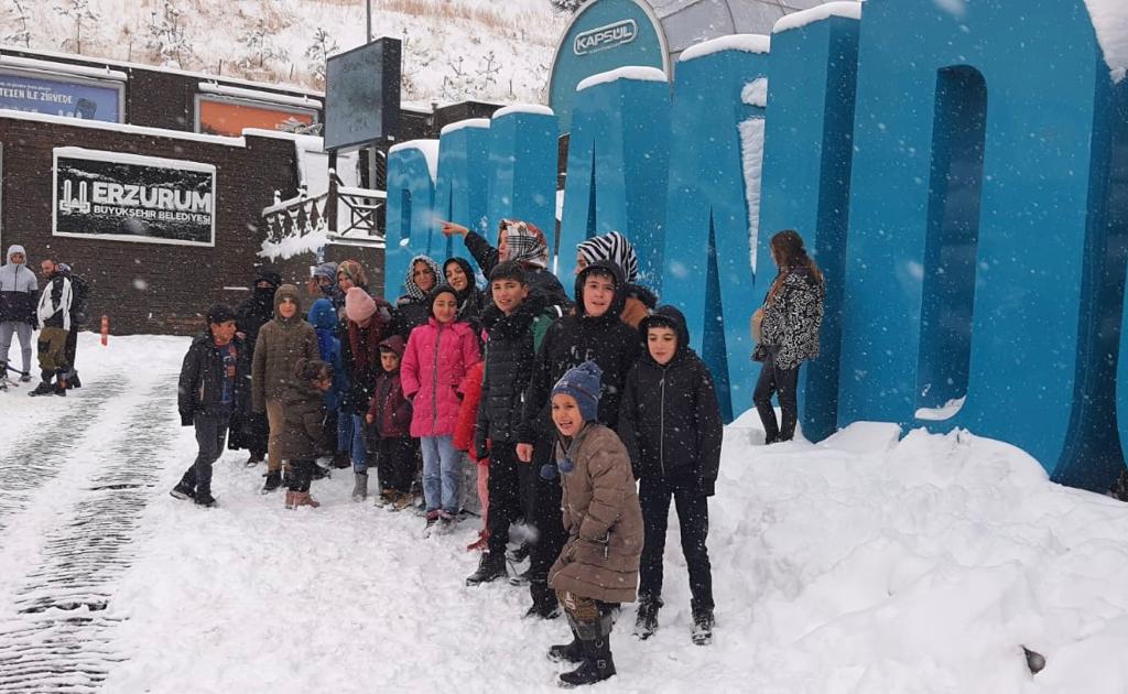 Palandöken Kayak Merkezinde gondol ve telesiyeje binen çocuklar, kızaklarla doyasıya eğlenerek, yemek programına katıldılar.