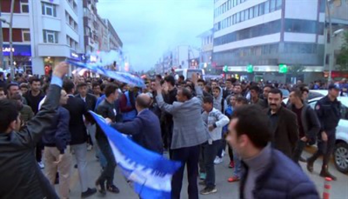 Maçın bitiş düdüğünün ardından Cumhuriyet Caddesi’ne akın eden mavi-beyazlı taraftarlar Play-Off sevincini doyasıya kutladı.