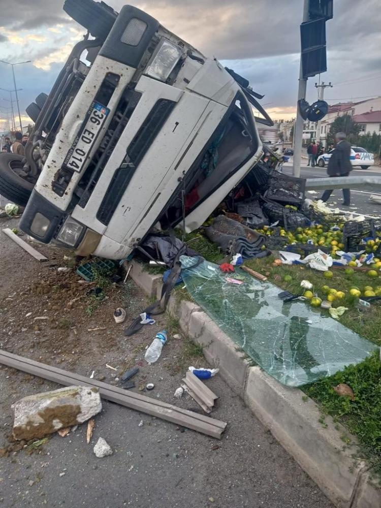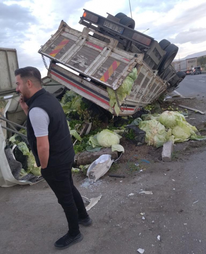 Erzurum’da sebze yüklü kamyon, otomobile çarptıktan sonra devrildi.
