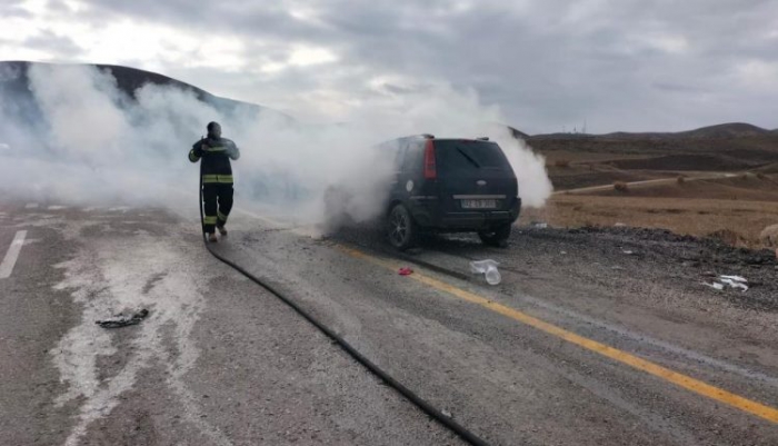 Giresun’dan Erzurum’un Horasan ilçesine düğüne gitmek için seyir halinde olan otomobil bilinmeyen bir sebepten dolayı Kop Dağında aniden alev aldı.