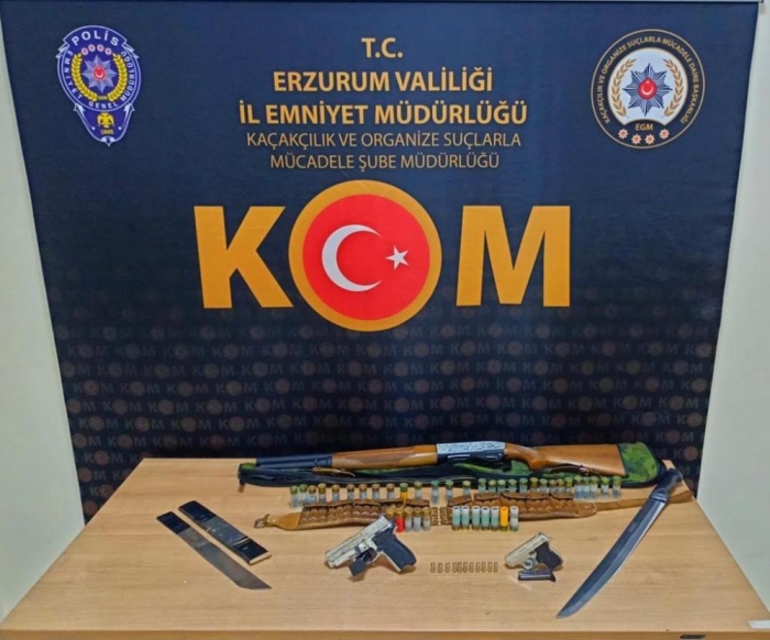 Şahısların ikametlerinde ve araçlarında yapılan aramalarda; 1 adet ruhsatsız tabanca, 1 adet kurusıkı tabanca, 11 adet tabanca fişeği, 2 adet sallama olarak tabir edilen bıçak, 1 adet av tüfeği ve 42 adet av tüfeği fişeği ele geçirildi.
