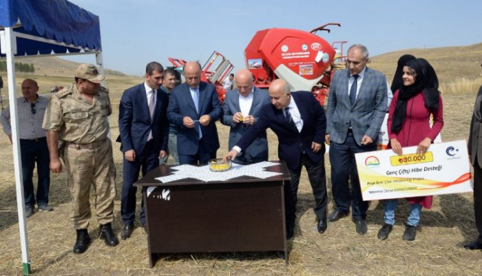 Konuşmaların ardından Vali Azizoğlu ve katılımcılar, üretim yapacak olan genç çiftçilere hediye çeklerini taktim etti. Ardından taş toplama ve katı gübre serpme makinalarının tanıtımı yapıldı.
