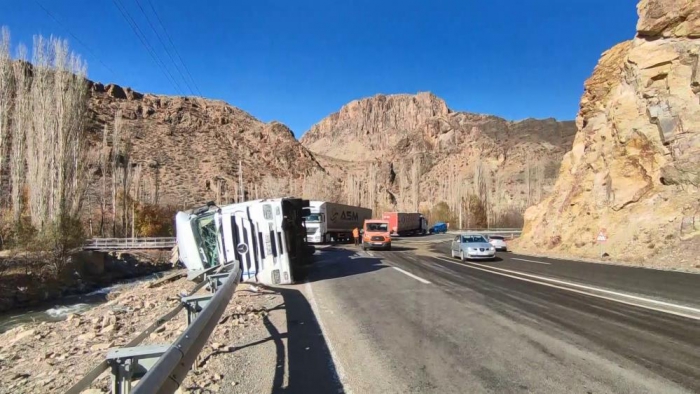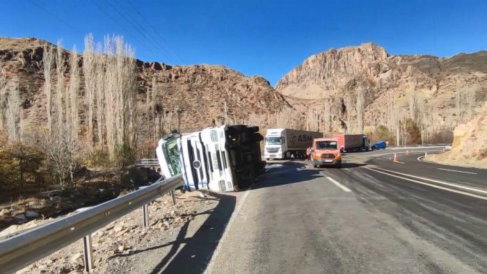 Edinilen bilgilere göre, Artvin-Erzurum karayolunda seyir halinde olan 04 D 5511 plakalı kereste yüklü tır, Erzurum’un Uzundere ilçesi mevkiinde, keskin bir virajda direksiyon hakimiyetinin kaybedilmesi sonucu bariyerlerin üzerine devrildi. Sürüklenerek nehir kenarına kadar yaklaşan tır son anda durabilirken, tır sürücüsü ise şans eseri kazayı yara almadan atlattı.