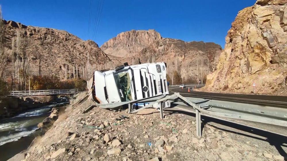 Erzurum’da şoförünün direksiyon hakimiyetini kaybetmesi sonucu kereste yüklü bir tır yoldan çıkarak, nehir kenarında bulunan bariyerlere devrildi.