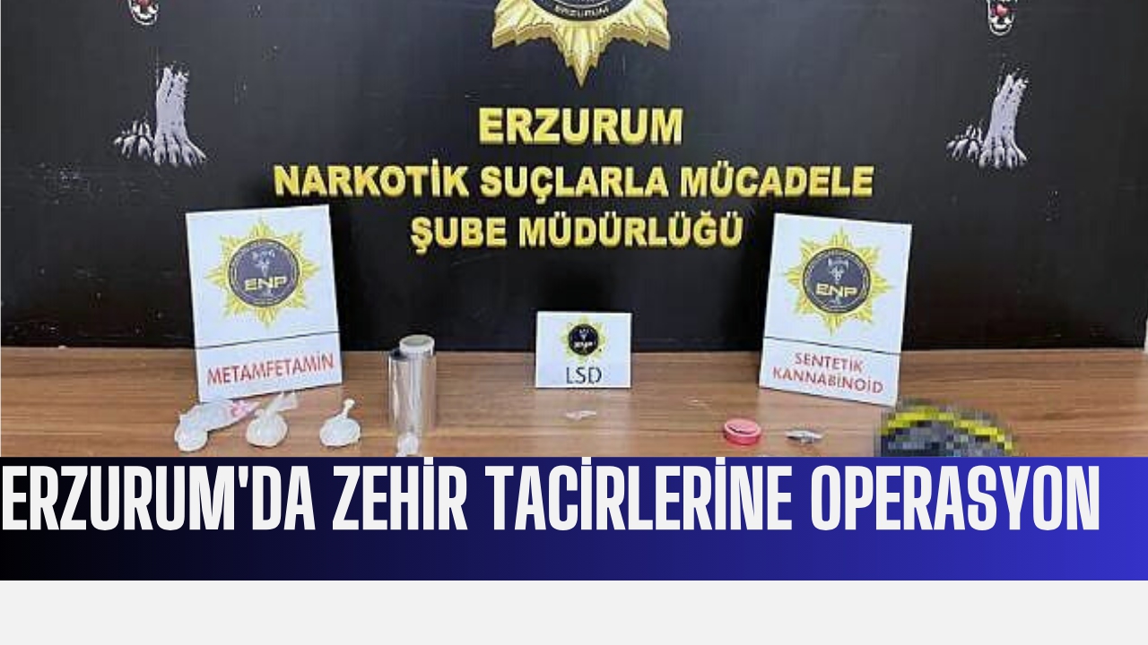 Erzurum Emniyet Müdürlüğü Narkotik Suçlarla Mücadele Şube Müdürlüğü ekiplerince il merkezinde uyuşturucu madde ticareti ve sevkiyatına yönelik yapılan çalışmalar neticesinde G.T.(25) ve G.P. (30) isimli şahıslardan yapılan arama işlemlerinde 122,38 gram sentetik kannabinoid maddesi, 104,15 gram metamfetamin maddesi ve 5 adet LSD maddesi, uyuşturucu madde kullanmaya yarayan 1 adet cam aparat ve 1 adet alüminyum folyo rulosu ele geçirildi.