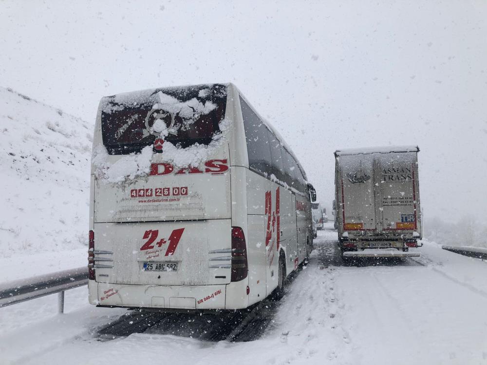 Bölgede sabah saatlerinde başlayan yoğun kar yağışı, şehirler arası trafiğin de durmasına neden oldu. Erzurum-Erzincan karayolu Aşkale Tepebaşı mevkiinde yüzlerce araç mahsur kaldı. Yolda kayan tır ve kamyonlar yolu trafiğe kapatırken, yolun gidiş ve geliş istikametinde yüzlerce araç mahsur kaldı. Karayolları ekiplerinin müdahale etmekte güçlük çektiği bölgede araçlar, yaklaşık 2 saattir yolun trafiğe açılmasını bekliyorlar.