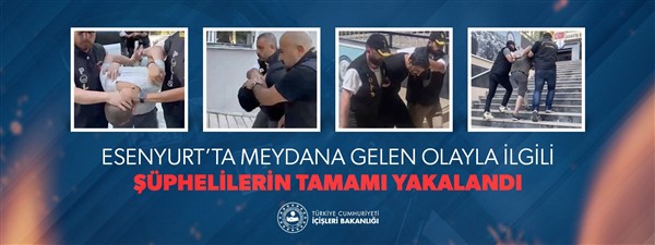 İçişleri Bakanı Yerlikaya, sosyal medya hesabından yaptığı açıklamada, İstanbul'un Esenyurt ilçesi Güzelyurt Mahallesi'nde meydana gelen olayın şüphelilerinden T.Ö. ve A.Ö'nün, İstanbul Emniyet Müdürlüğü ekiplerince yakalandığını kaydetti.