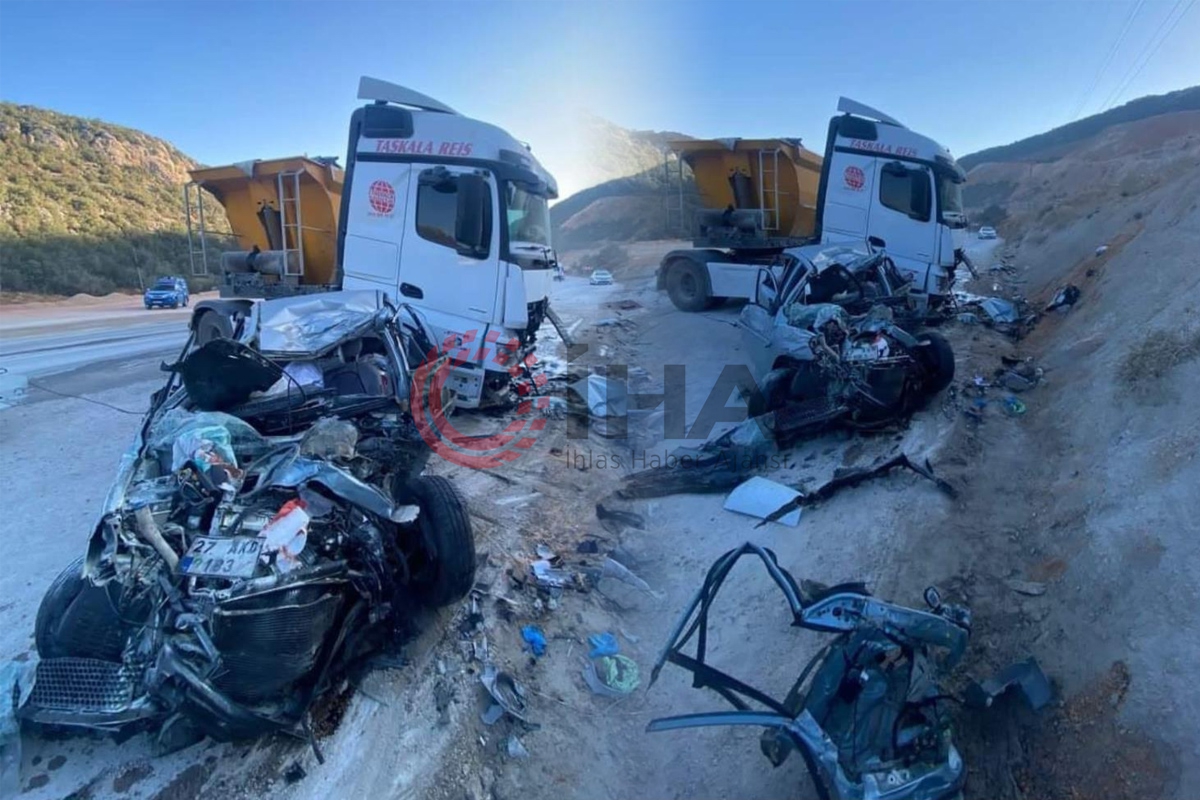 Kaza, sabah saat 06.20 sıralarında Gaziantep-Nurdağı karayolunun 20. kilometresinde meydana geldi. İddiaya göre, Nurdağı istikametinden Gaziantep istikametine seyir halinde olan İmdat A. idaresindeki 27 AKD 183 plakalı otomobile, kum ocağından çıktığı öğrenilen ve plakası ile sürücüsü öğrenilemeyen hafriyat yüklü kamyon çarptı. Feci kazanın ardından ortalık savaş alanına dönerken, çevredeki vatandaşlar, 112 Acil Çağrı Merkezine ihbarda bulundu.