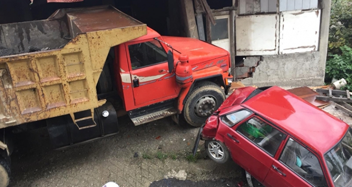 Zonguldak’ta freni patlayan kamyon, 2 otomobile çarptı, bir eve çarparak durabildi.