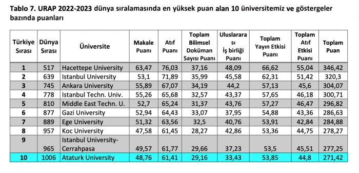 Son yıllarda bölgesel kalkınma misyonu başta olmak üzere ülke gelişimi için çok sayıda proje üreten, yakaladığı başarı ivmesiyle birlikte gerek Türkiye sıralamasında gerekse dünya sıralamasındaki yükselişine sürdüren Atatürk Üniversitesi, dünyanın saygın sıralama kuruluşlarında elde ettiği başarılara bir yenisini daha ekleyerek URAP listelerinde Türkiye sıralamasında ilk onda, Dünya sıralamasında ise bin bandında yer alarak önemli bir başarının daha altına imza attı.