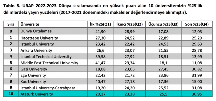 Üniversitelerin 2021'de ürettikleri makale sayısı ile 2021'den geriye doğru 5 yıllık bir değerlendirmeyle atıf sayısı, toplam bilimsel doküman sayısı, toplam yayın etkisi, toplam atıf etkisi ve uluslararası iş birliği alanlarındaki performansına göre yapılan sıralamalarda Atatürk Üniversitesi yükselişini sürdürdü.