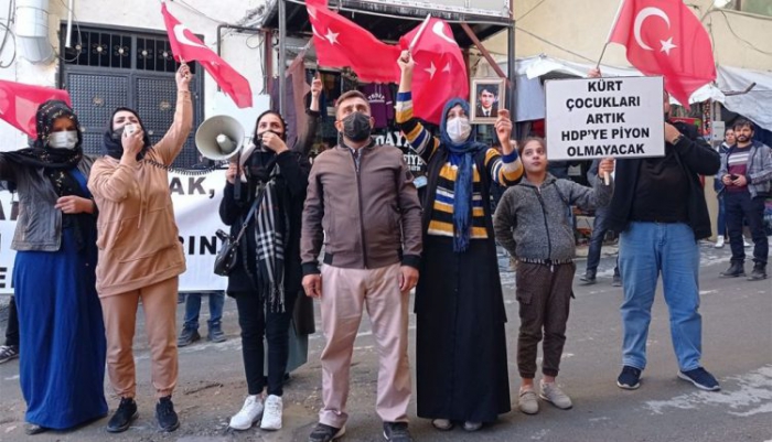 Cumhuriyet Caddesi’nde bir araya gelen terör mağduru aileler, ellerinde “Kahrolsun PKK”, “Çocuklarımızı geri verin”, “PKK kaybedecek anneler kazanacak” sloganları atarak “Kürt çocukları artık HDP’ye piyon olmayacak” pankartı taşıdı.