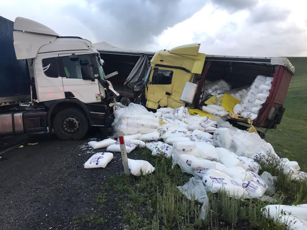 Kaza, dün akşam saatlerinde Erzurum Horasan-Ağrı yolu üzerinde bulunan Saçdağı Geçidi yakınlarında meydana geldi. Yağışlardan dolayı yolun kayganlaşması ile direksiyon hakimiyetini kaybeden, Iğdır'dan Horasan istikametine gelmekte olan 76 DF 796 plakalı Osman Özer yönetimindeki tır, karşı yönden gelen 13 A 654 10 İran plakalı Talebnavehsi Morteza yönetimindeki tır ile kafa kafaya çarpıştı.