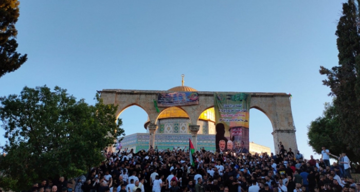 İşgal altındaki Kudüs’te yaşayan Filistinliler, İsrail’in saldırılarının tehlikesine rağmen bayram namazında Mescid-i Aksa’yı doldurdu. Mescid-i Aksa’nın avlusunda toplanan Filistinliler Kudüs ve Gazze Şeridi’nde İsrail saldırılarında şehit edilen Filistinliler için dua etti. Bayram namazı için Mescid-i Aksa’da toplanan binlerce kişi, bayram namazını eda etti. Kudüs İslami Vakıflar İdaresi, 100 binden fazla kişinin bayram namazını kılmak için Harem-i Şerif’e geldiğini bildirdi. Bayram nazının kılınmasının ardından Mescid-i Aksa’nın çevresinde İsrail karşıtı protesto düzenledi. Protesto gösterisinde Filistin bayrağı açan binlerce kişi, İsrail karşıtı slogan attı.