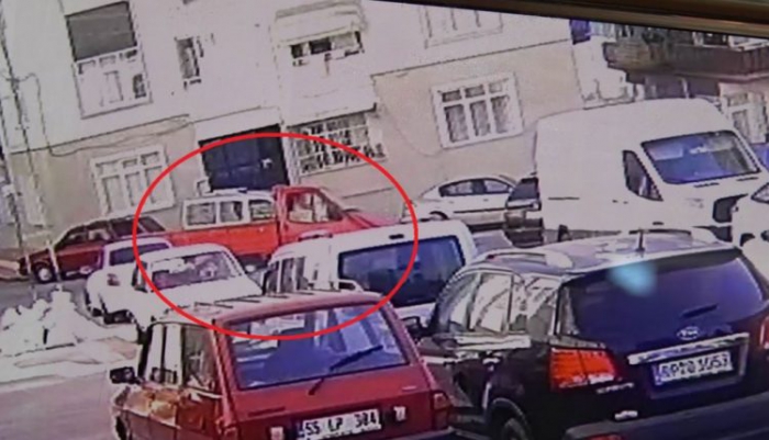 Mahalle sakinleri kaçan aracın plakasını alamazken, kırmızı renkli kamyonetin bir otomobile çarpıp yokuş aşağı kaçma anı ise olay yerinde bulunan güvenlik kamerasına yansıdı.