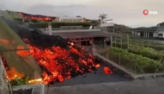 İspanya’ya bağlı Kanarya Adaları’nın en büyük 5. adası La Palma’da yer alan Cumbre Viejaya Yanardağından akan lavlar, ulaştığı yerleşim yerindeki bir havuzu doldurdu.