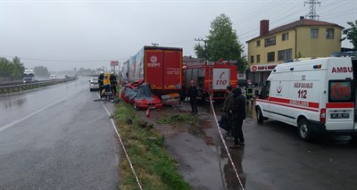 Kocaeli’nin Kartepe ilçesinde aşırı yağış nedeniyle kayganlaşan yolda sürücüsünün direksiyon hakimiyetinin kaybettiği otomobilin park halindeki tıra çarpması sonucu meydana gelen kazada 1 kişi öldü 1 kişi yaralandı.