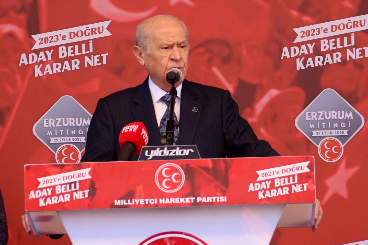 MHP Genel Başkanı Devlet Bahçeli, "2023'e Doğru: Aday Belli, Karar Net" temalı açık hava toplantıları kapsamında Erzurum’da İstasyon Meydanı'nda konuştu. Bahçeli’nin açıklamalarından satır başları şu şekilde: Yurdumun her insanını muhabbetle kucaklıyorum. Erzurum’da deniz yok diyorlar. Evet yok ama ben burada sevda okyanusu görmekteyim. Niyaz ederim ki Allah sizi kötü niyetten ilelebet korusun. Türkiye muhaliflerinin kalın maskesi 2023’te yırtılıp atılacaktır. Türk milleti mührü eline aldığında zillet partilerini gören olmayacaktır.