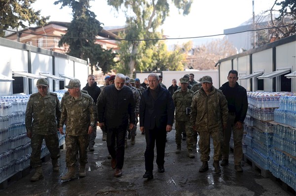Merkez üssü Kahramanmaraş'ın Pazarcık ve Elbistan ilçeleri olan ve 11 ili etkileyen "asrın felaketi"nin hemen ardından beraberindeki Genelkurmay Başkanı Orgeneral Yaşar Güler ile geldiği Hatay’da Mehmetçiğin nöbet, devriye, arama-kurtarma ve yaşam destek faaliyetlerini yerinde takip eden Bakan Akar'ın deprem bölgesindeki incelemeleri de devam ediyor.