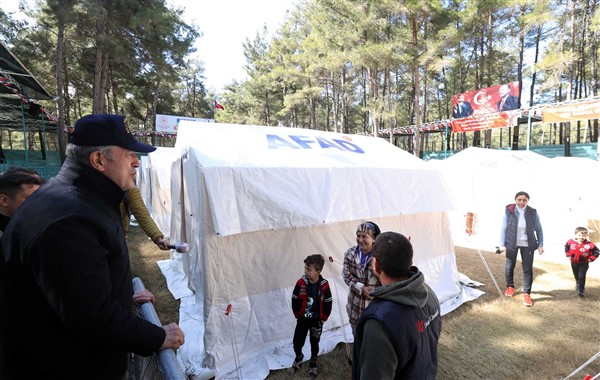 Çadır kent çıkışında bir kadın "Hep sizi görmek istiyordum. Allah sizden razı olsun." diyerek Bakan Akar'a sarılırken geçmiş olsun dileklerini ileten Bakan Akar da "Acımız, kederimiz büyük. Bu yaraları sarmak için ilk günden itibaren asil milletimizle birlikte omuz omuza çalışarak tek yumruk, tek yürek olarak inşallah tüm bu sıkıntıların üstesinden gelecek, yaralarımızı saracağız." diye konuştu.