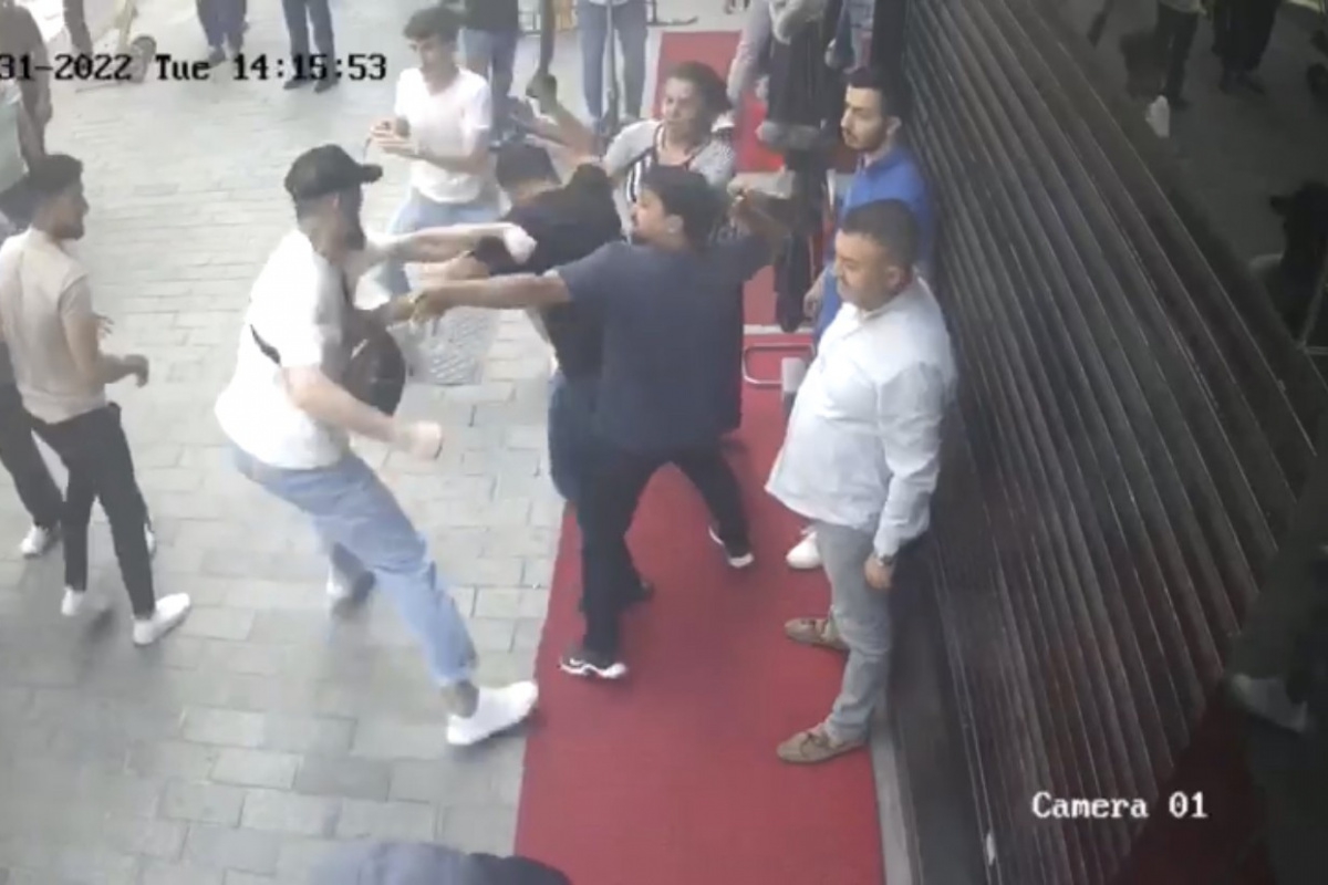 Savaş meydanlarını aratmayan kavga bir işyerinin güvenlik kameralarına yansıdı. Görüntülerde, transfer merkezi önünde bekleyen kişilerle esnaf tartışıyor. Daha sonra iki taraf birbirlerine saldırmaya başlıyor. Yaklaşık 50 kişinin karıştığı kavga güç de olsa ayrılıyor.