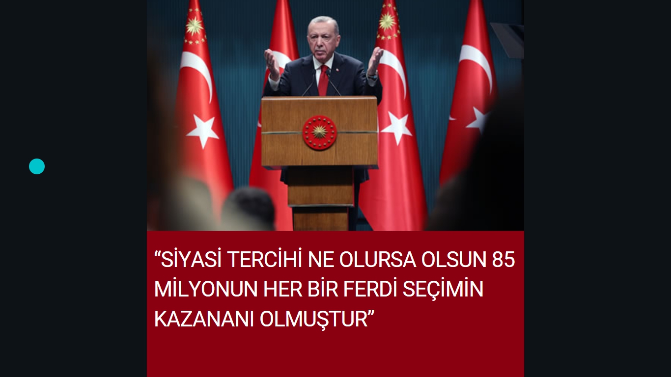 Cumhurbaşkanı Erdoğan, Cumhurbaşkanlığı Kabinesi Toplantısı’nın ardından yaptığı açıklamada, “Seçimin, siyasi olarak kazananları elbette bellidir. Ama bu seçimlerde bizimle ve ittifakımızla birlikte tüm Türkiye kazanmıştır. Siyasi tercihi ne olursa olsun 85 milyonun her bir ferdi kazanmıştır” dedi.