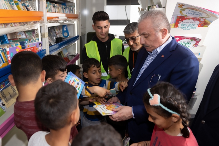 Çadır Kent'teki çocuklarla da bir araya gelen Şentop, alanda bulunan 'Gezici Kütüphane’ye de girerek, çocuklarla birlikte kitapları inceledi. Şentop, daha sonra yapımı süren yerlere ilişkin ilgililerden bilgi aldı.