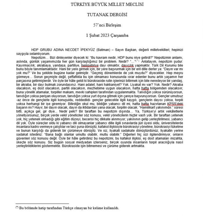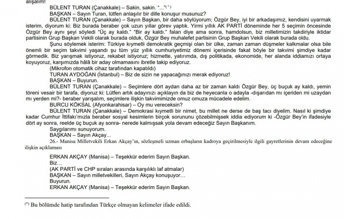 "Bu kelime tutanağa yazılmamış, dipnot konulmuş, altta 'Hatip tarafından Türkçe olmayan bir kelime kullanılmıştır' yazılmış. Kelimenin ne olduğunu biz tabii sesli kayıtlardan görebiliyoruz. 2 Şubat'ta ise AK Parti Grup Başkanvekili Sayın Bülent Turan konuşmasında İngilizce ifade kullanmış, bu da tutanağa yazılmamış; işaret konulmuş, altta 'Hatip tarafından Türkçe olmayan kelimeler kullanılmıştır' diye yazılmış. Bunu Kürtçe'ye mahsus bir uygulamaymış gibi yansıtmak ve çarpıtarak 'bilinmeyen dil' gibi bir ibareyle yansıtmak çok yakışıksız.