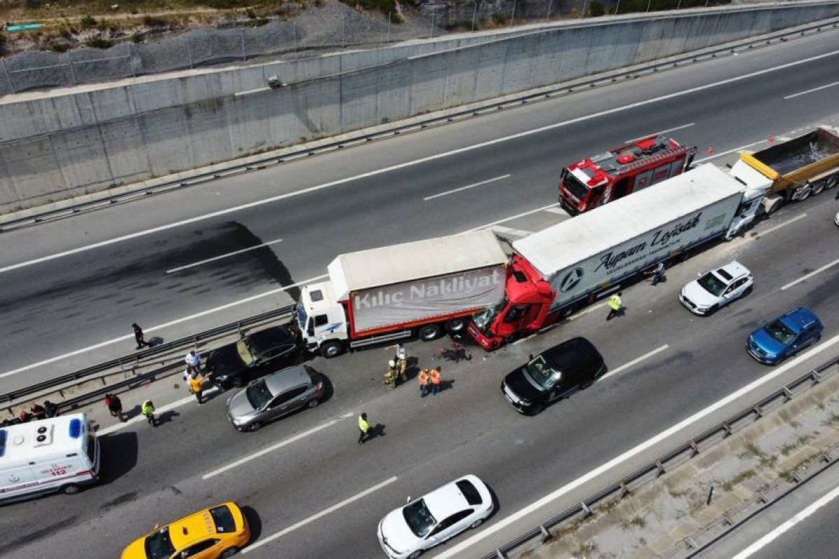 İstanbul Sultanbeyli TEM Otoyolu’nda bir otomobilin ani fren yapması sonrası 3 tır ve 1 lüks otomobilin karıştığı kaza meydana geldi. Kazaya sebebiyet veren sürücü olay yerinden kaçtı. Araçlarda büyük çapta maddi hasar oluşurken kazada hafif yaralanan 2 tır şoförünün tedavisi ayakta gerçekleştirildi. Kazanın yaşandığı alan havadan görüntülendi. .